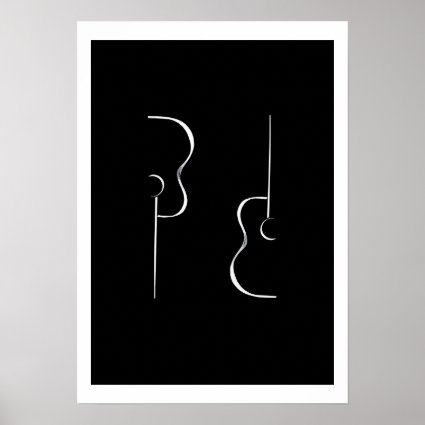 A simple yet eye-catching design featuring two silhourette outlines in white of acoustic guitars on a black background with a white border. Stylish and artsy, this poster print will look perfect on the wall in a music studio or in the bedroom or living room of a guitarist or music lover. This poster is also available with a black silhouette on a white background with a black border as shown below.