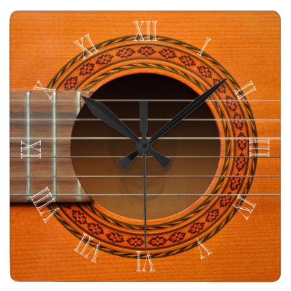 A fun wall clock for the classic guitarist - this clock features a close up image of a classical guitar or Spanish guitar which has a decorative rosette around the sound hole. White Roman numerals are placed around the rosette.